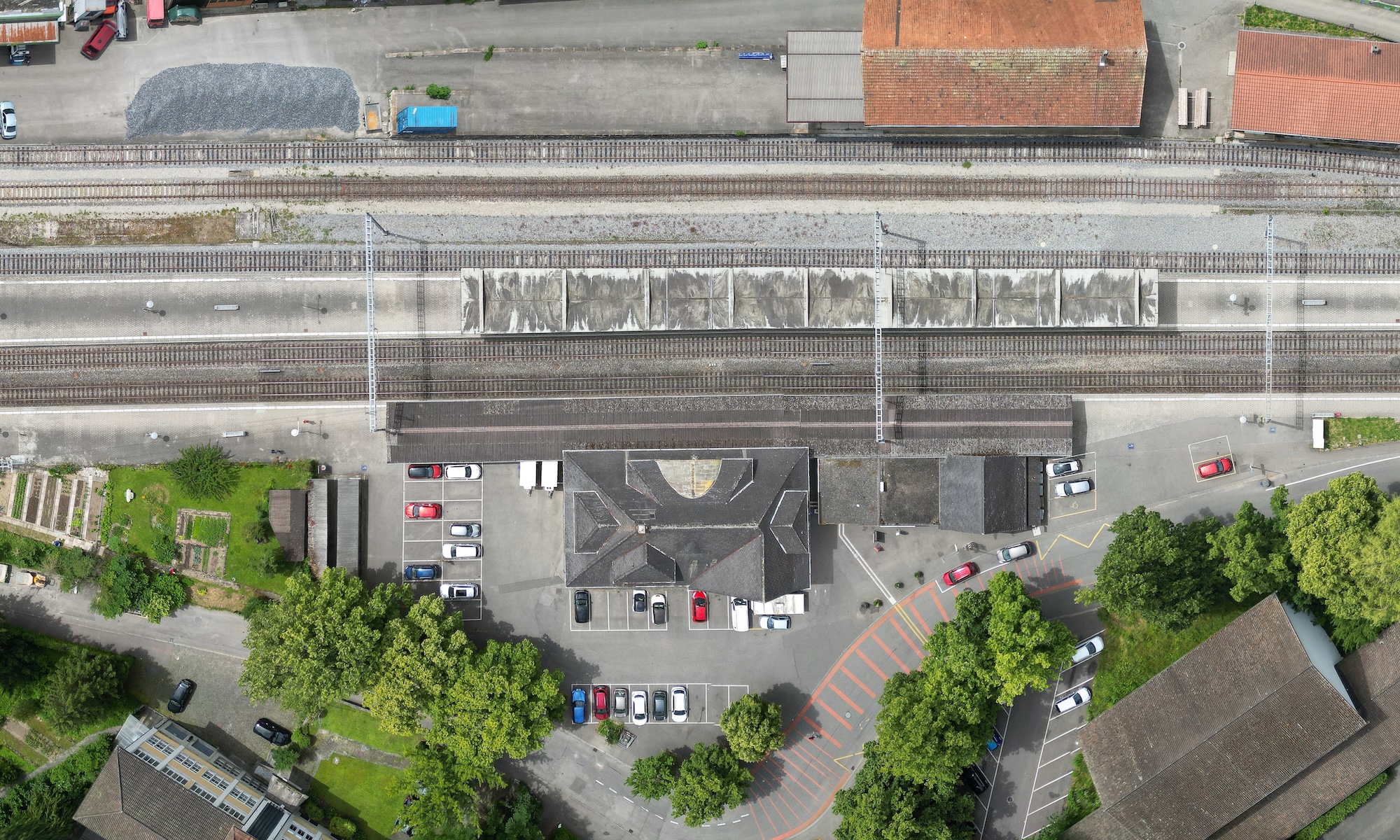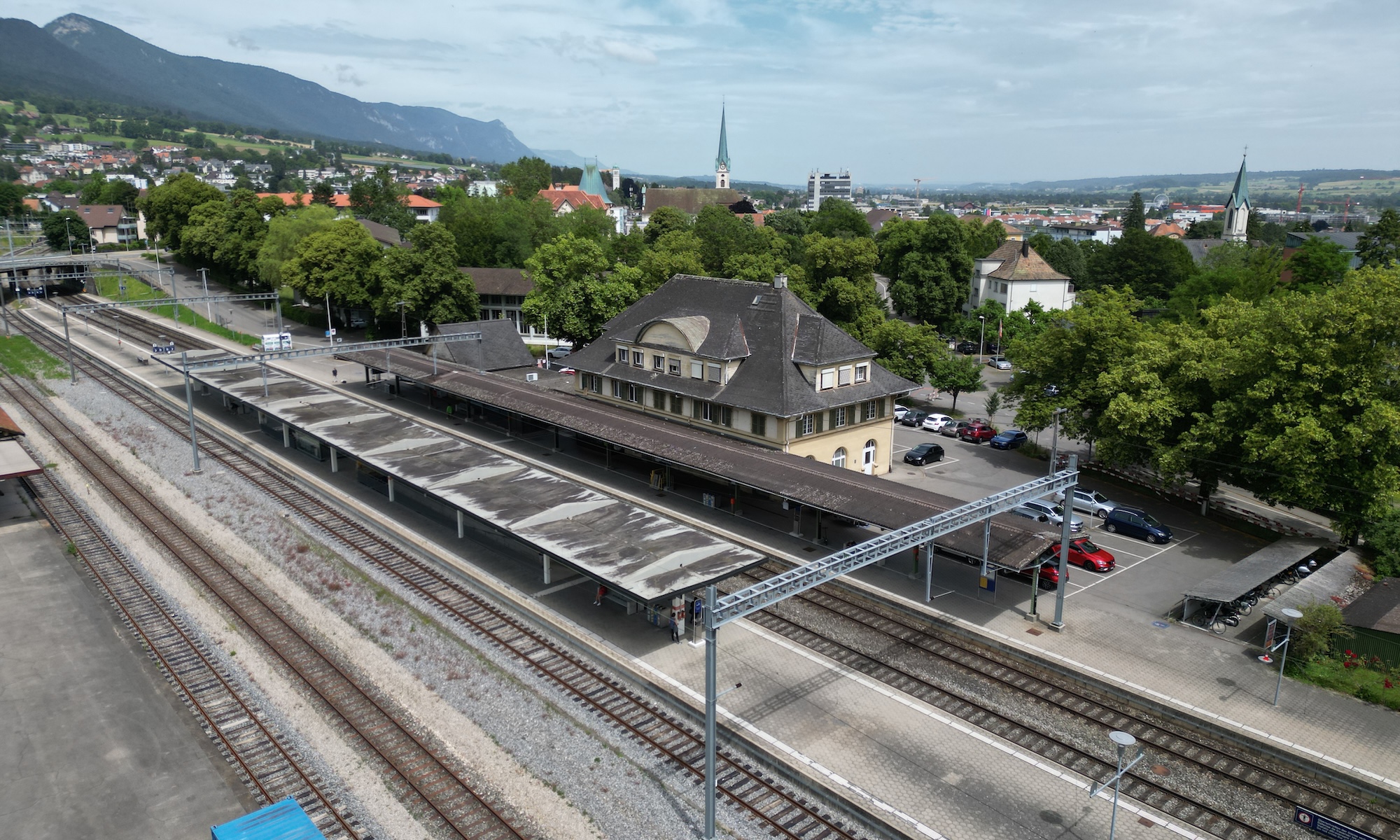 Das markante Aufnahmegebäude mit wehrhaftem Sockel und charakteristischem Dachwerk weist heute einen hohen Instandsetzungsbedarf auf. Statische Ertüchtigungsmassnahmen sollen die Sicherheit des Bauwerkes gewährleisten. Die Gebäudehülle und die Haustechnik sind umfassend zu sanieren. Gleichzeitig ist der Brandschutz auf den heutigen Normenstand zu bringen. So bleibt die historische Substanz erhalten, während das Gebäude sicher und zeitgemäss genutzt werden kann. In den vormaligen Schalter- und Wartezonen im Erdgeschoss befinden sich Verkaufs- und Büroflächen, in den Obergeschossen Wohnungen.