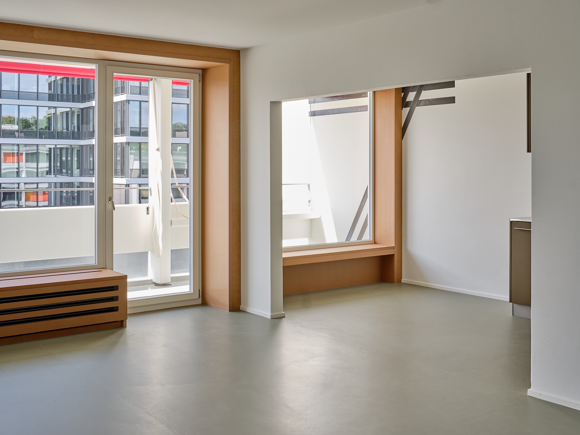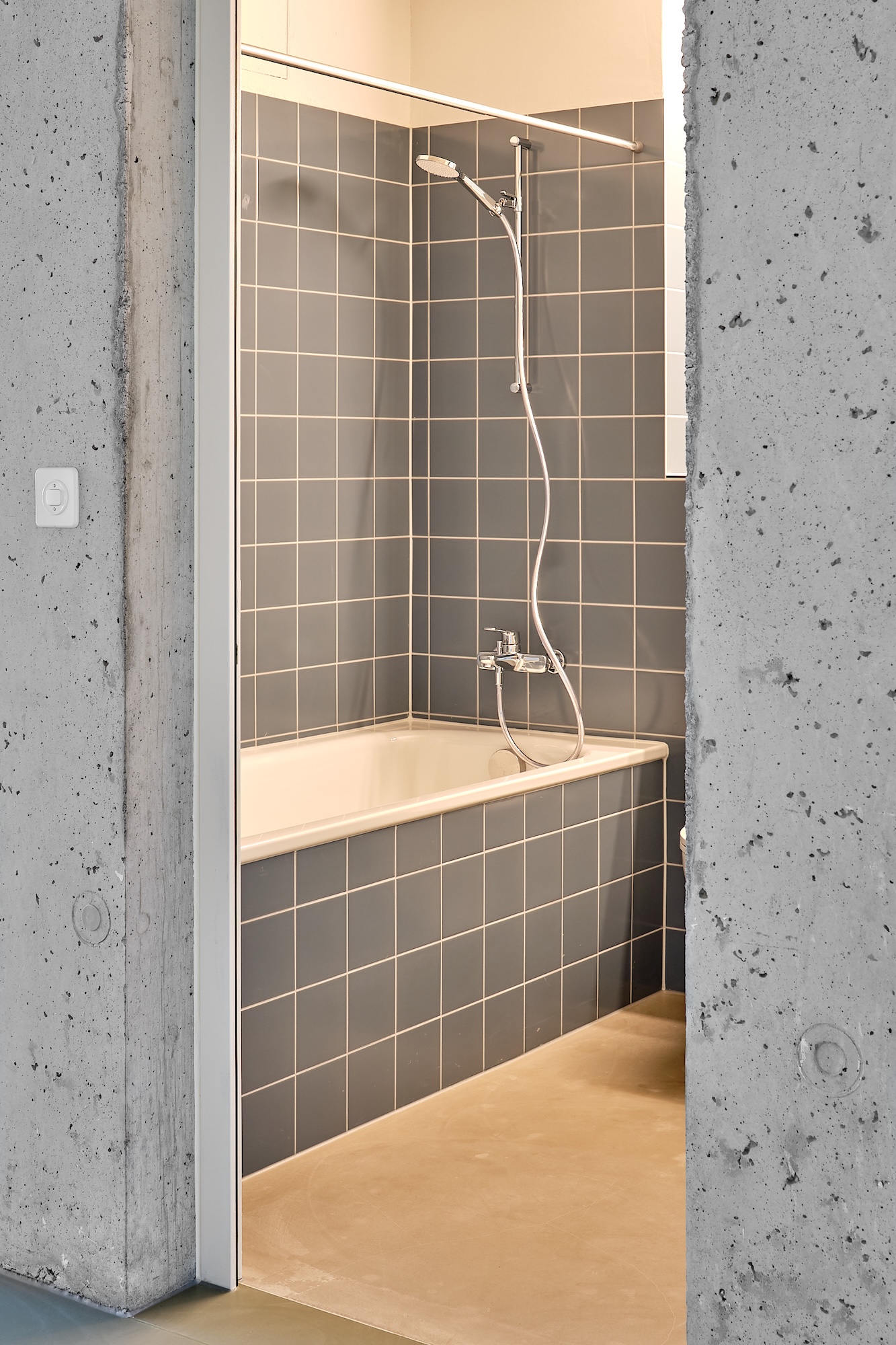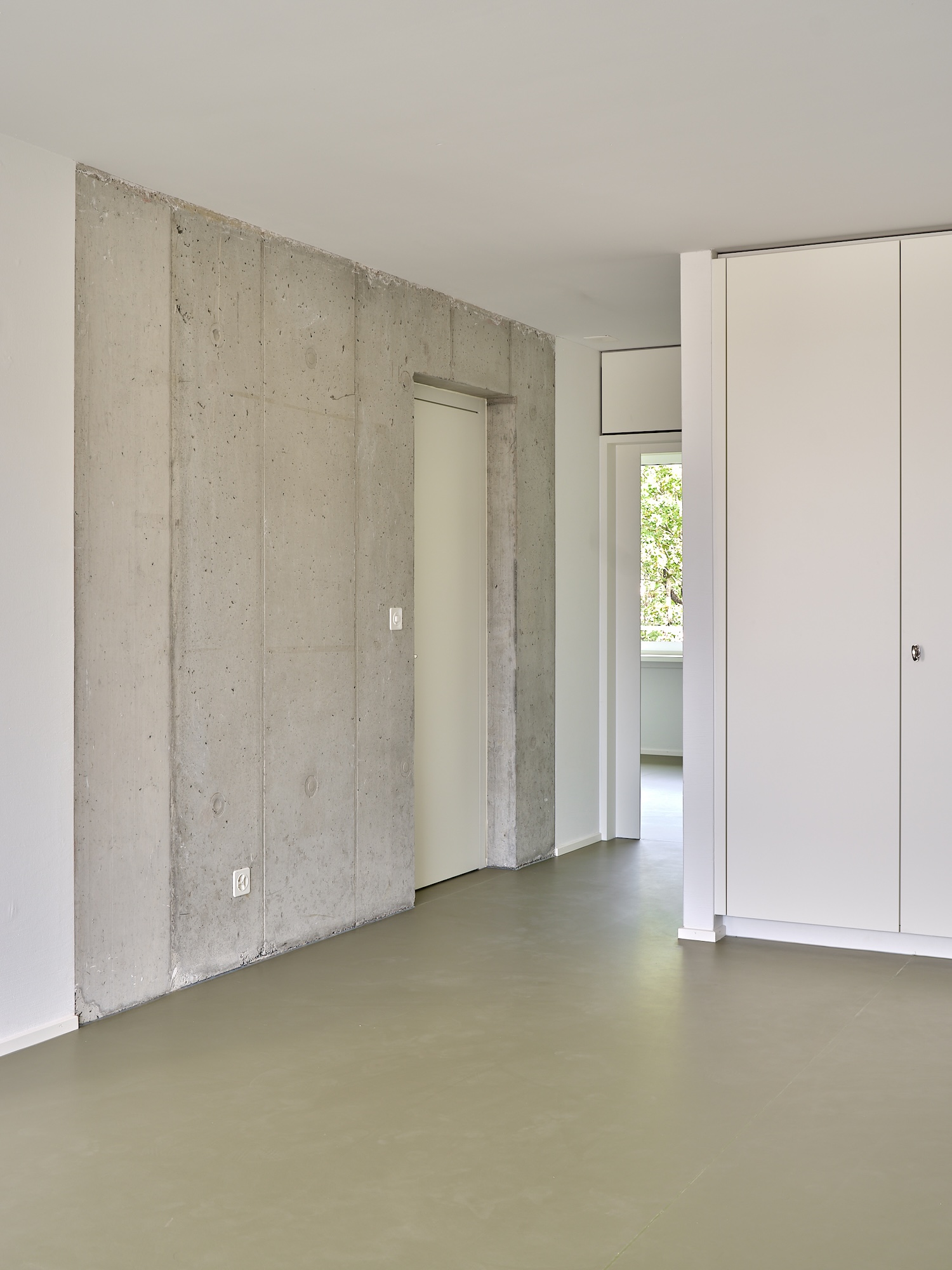Soweit möglich wurden Bauteile belassen oder wiederverwertet und in die Erneuerung der Wohnungen integriert. Zusätzliche strukturelle Elemente, wie beispielsweise die aus statischen Gründen notwendigen Betonkerne und Klebelamellen oder Einbauten zur energetischen Verbesserung sind bewusst sichtbar. Die neuen energieeffizienten Anlagen Wärme/Kälte/Lüftung, betrieben mit erneuerbarer Energie, werden im Wohnbereich in bestehende und neue Einbauten integriert und dienen den Bewohnenden als Sitzelement oder Ablage.