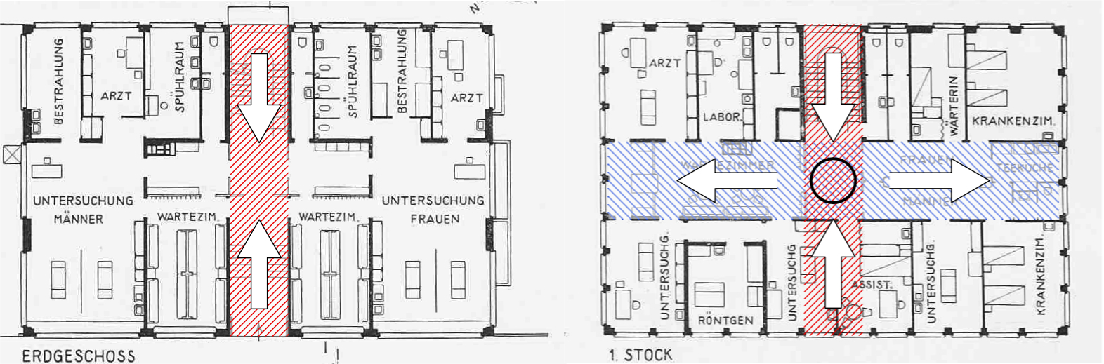 Der ursprüngliche Grundriss weist eine klare zweigeteilte Erschliessungsstruktur auf, welche die städtische Polyklinik nach Geschlechter in zwei Hälften aufteilt. Der dunkelgrüne Kunststein-Bodenbelag im Treppenhaus unterstreicht die klare Gliederung.