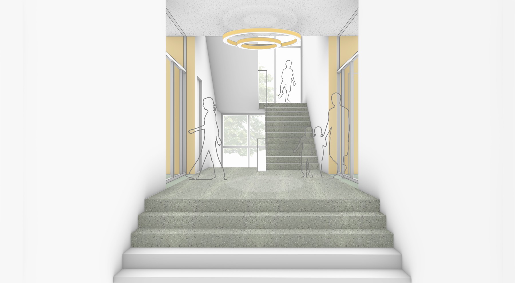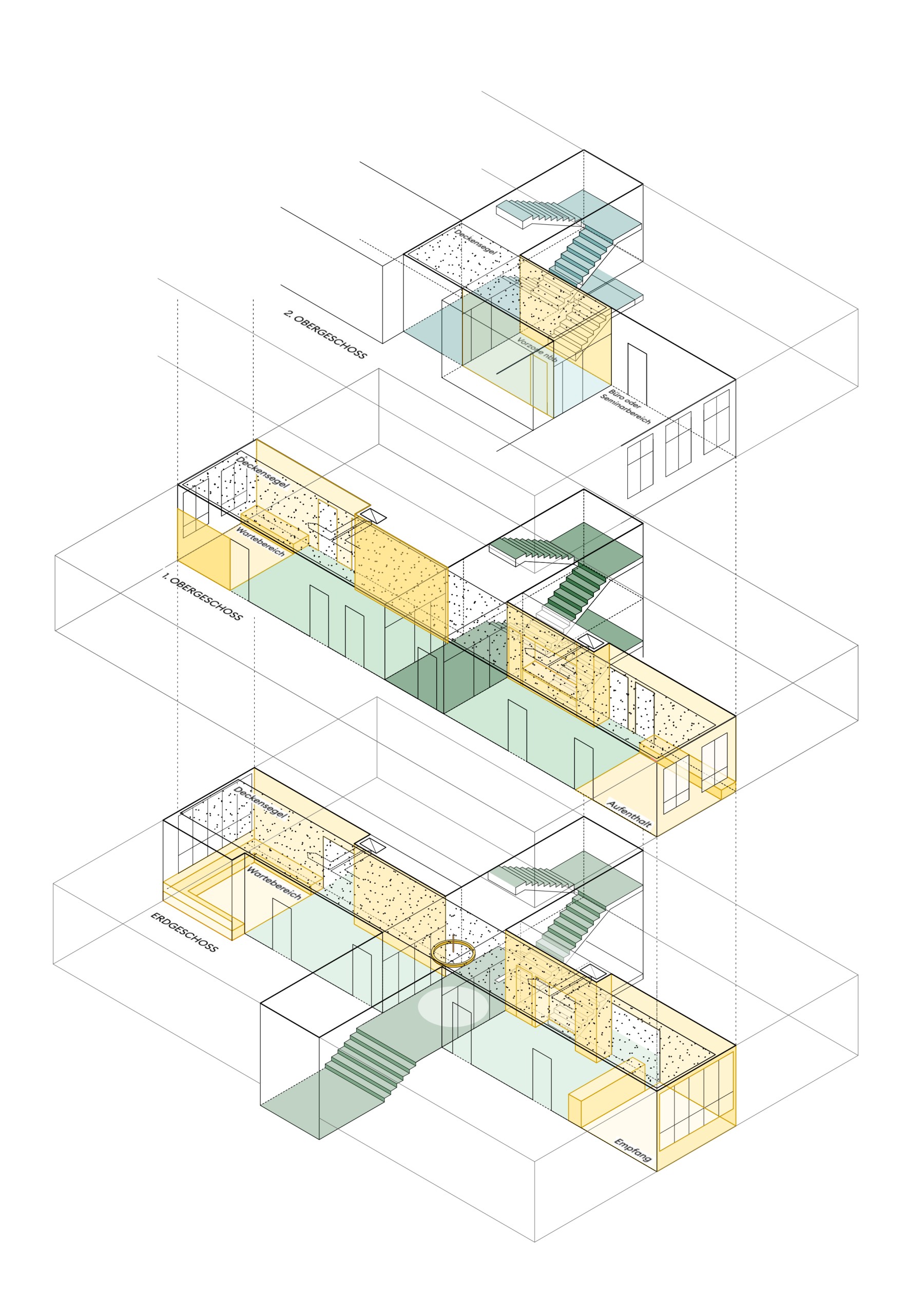 Mit der Instandsetzung soll die klare Gebäudegliederung herausgearbeitet, und auf die neuen Nutzungen abgestimmt werden: Die publikumsorientierte Mittelzone wird geschossweise als Ganzes erlebbar gemacht, nichttragende Zwischenwände werden entfernt und -wo nötig- durch Glasabschlüsse ersetzt. Damit wird Tageslicht in das aktuell dunkle Gebäudezentrum geholt.
