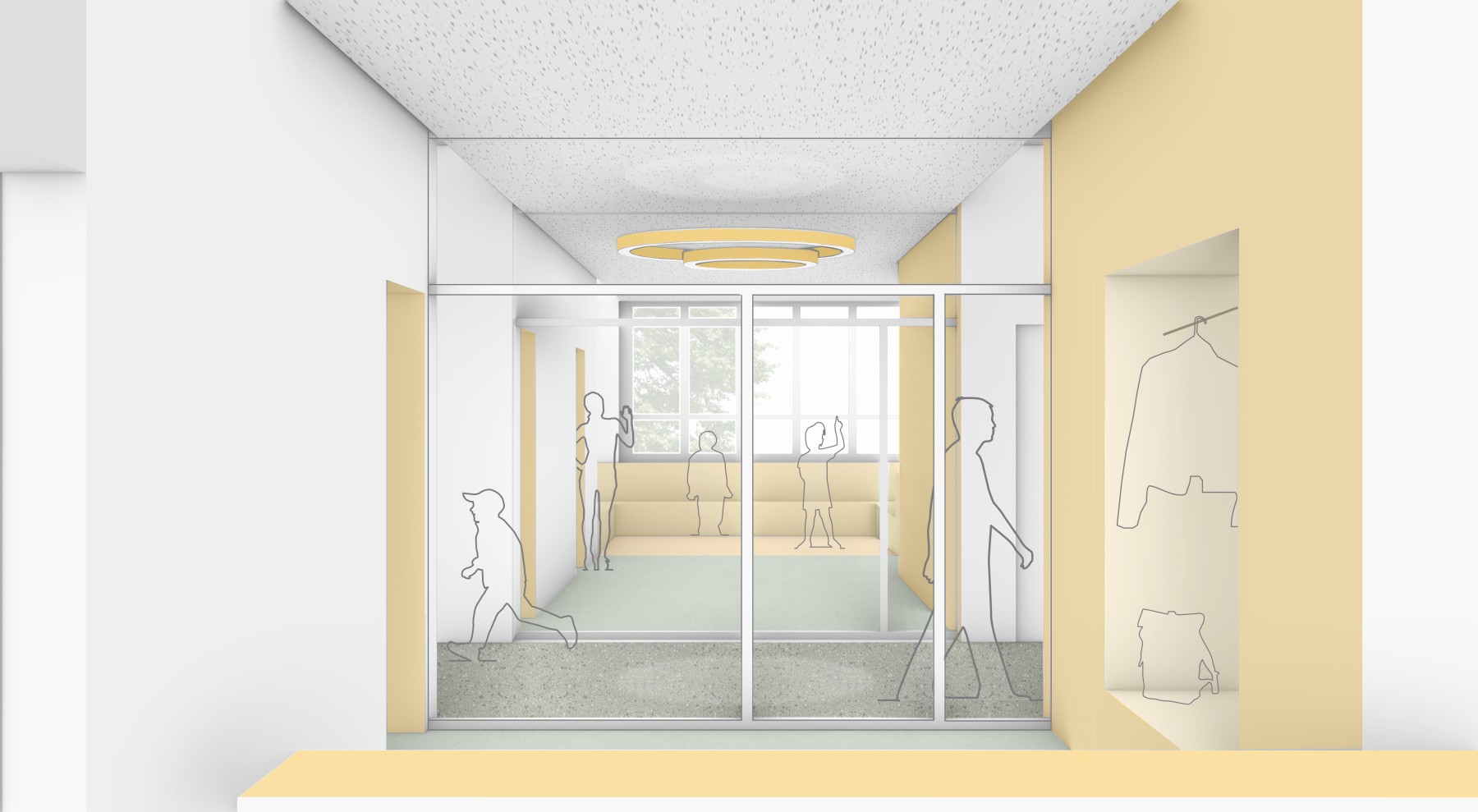 Das helle Gelb ist der bauzeitlichen Farbgebung (Plattenbeläge, Medizinalmobiliar) nachempfunden und ergänzt die mattgrünen Zirkulationsflächen, welche sich an den dunklen Kunststeinbelag im Treppenhaus anlehnen.