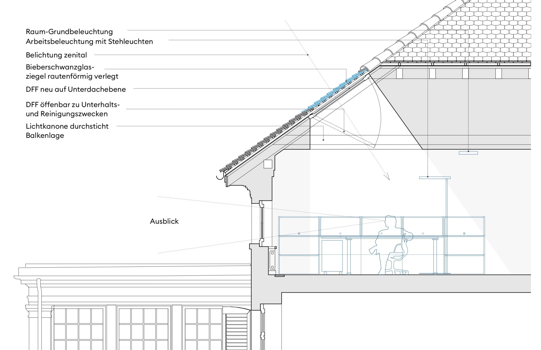 Integrieren - Interventionen aus Anforderungen an Haustechnik, Sicherheit, Brandschutz und baurechtliche Anforderungen wie Hindernisfreiheit und Belichtung zeichnen sich durch die gleiche formal zu- rückhaltende dekorative Durchgestaltung wie der Bestand aus.