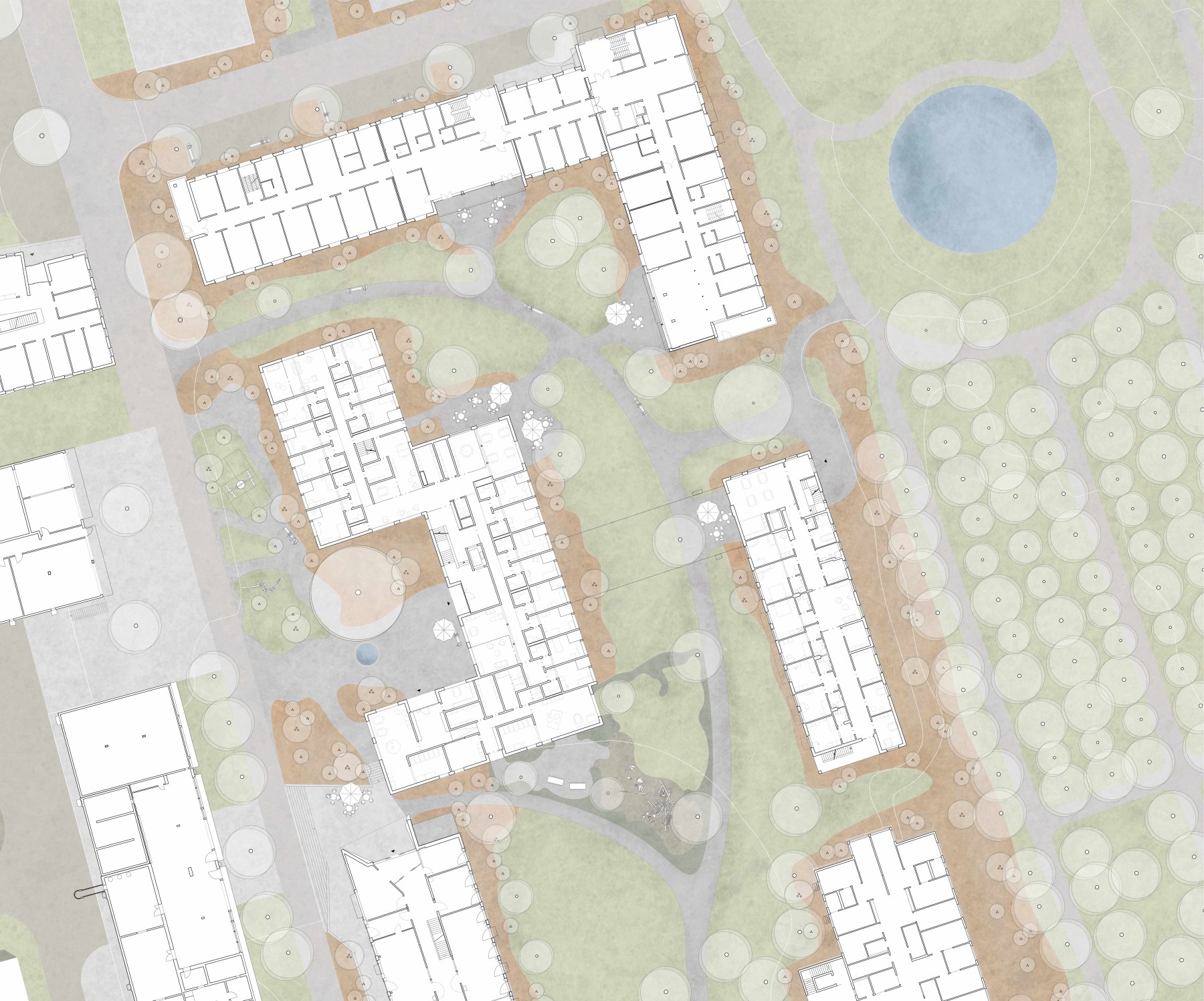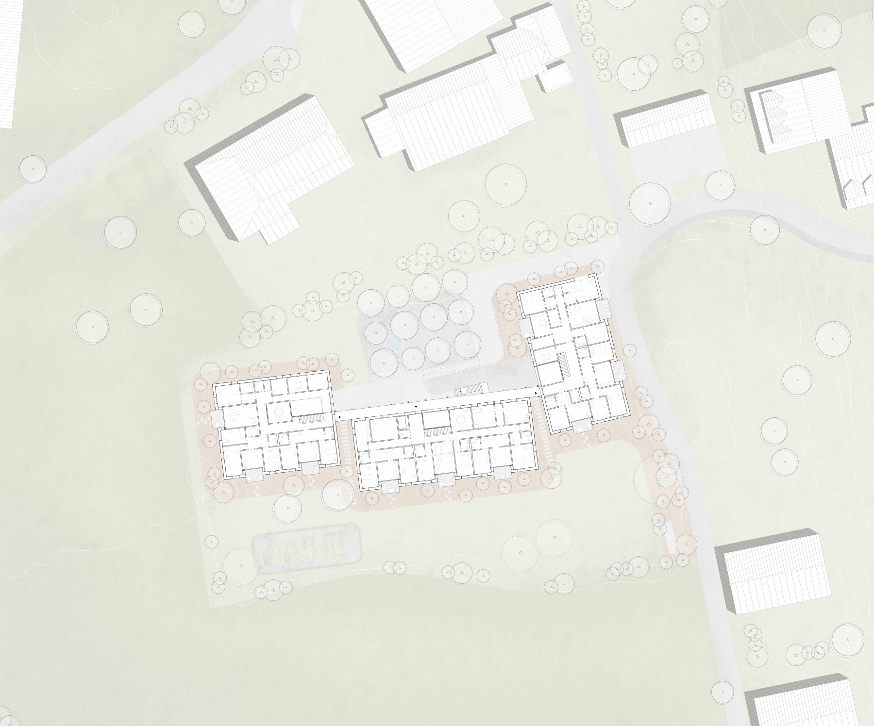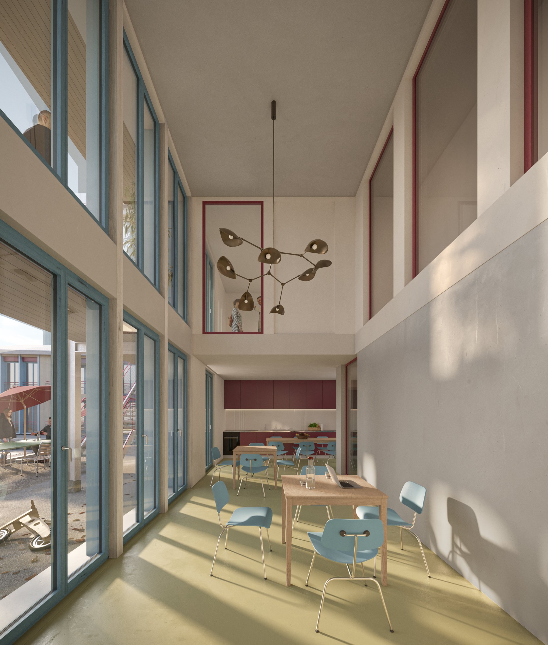 Drei Häuser beherbergen je eine über 2 Geschosse organisierte Doppelwohngruppe mit einem 2-geschossigen Gemeinschaftsraum. Die clusterartige Organisation der Wohngruppen nimmt die eigentliche vorgesehene Wohnnutzung vorweg.