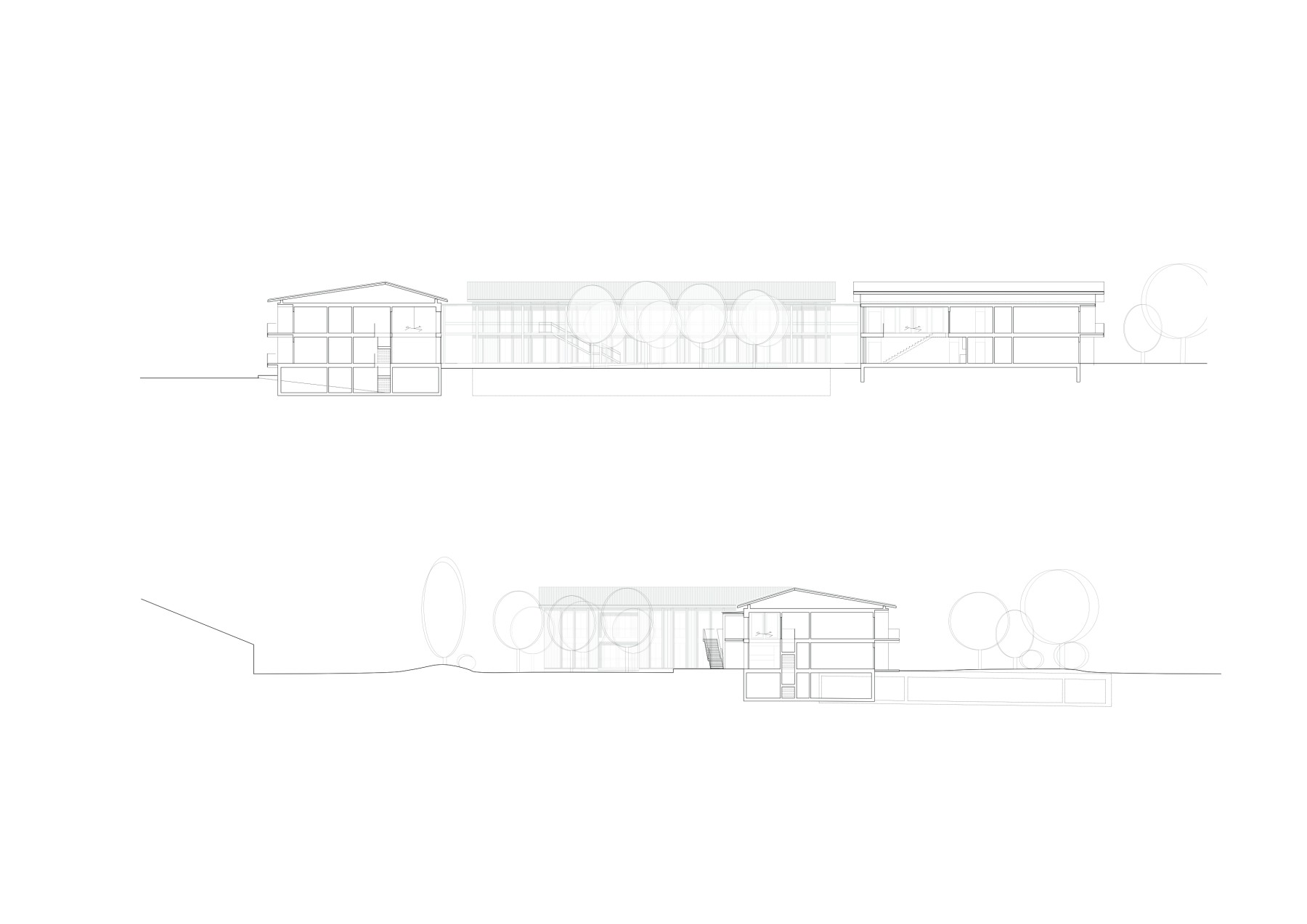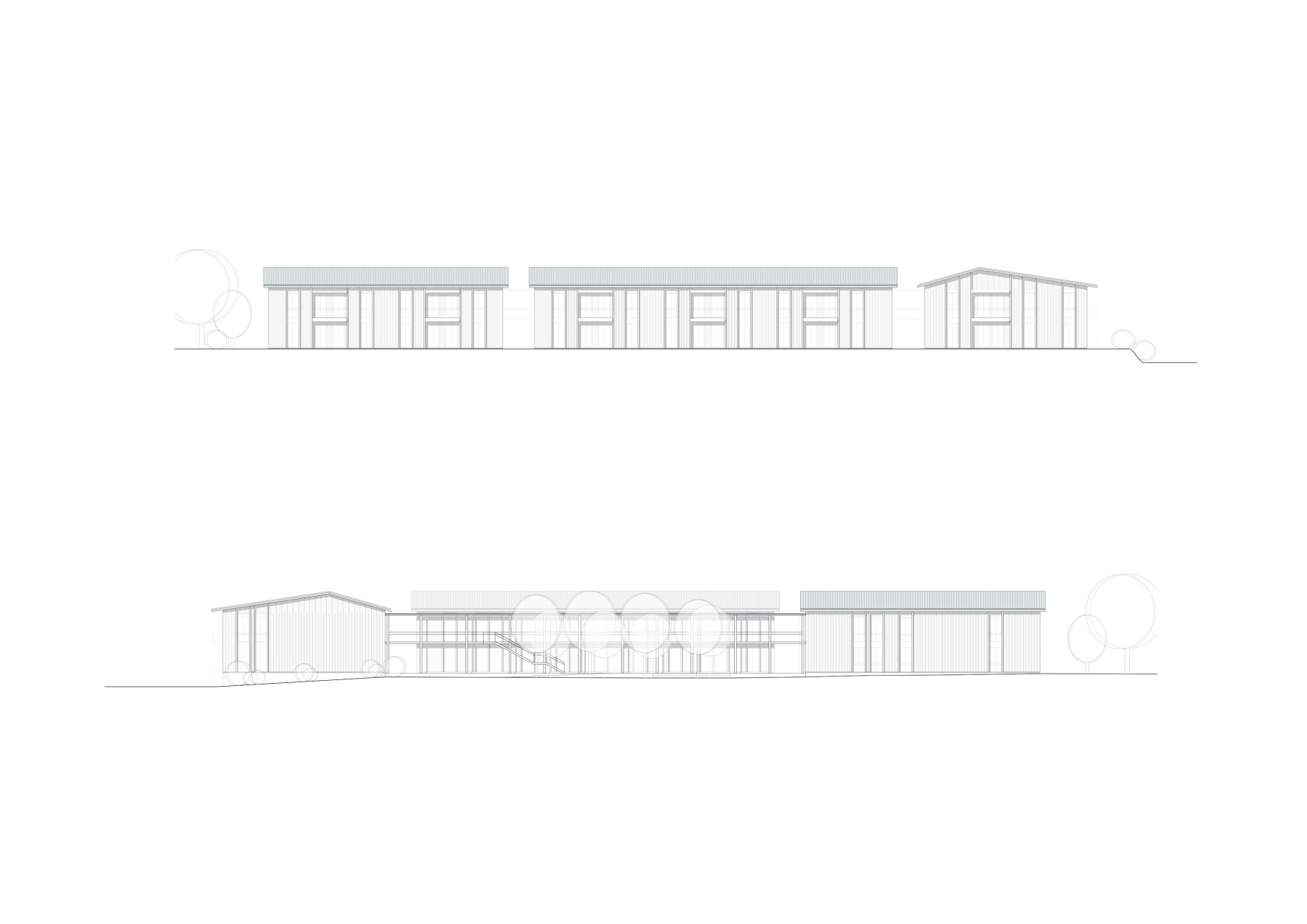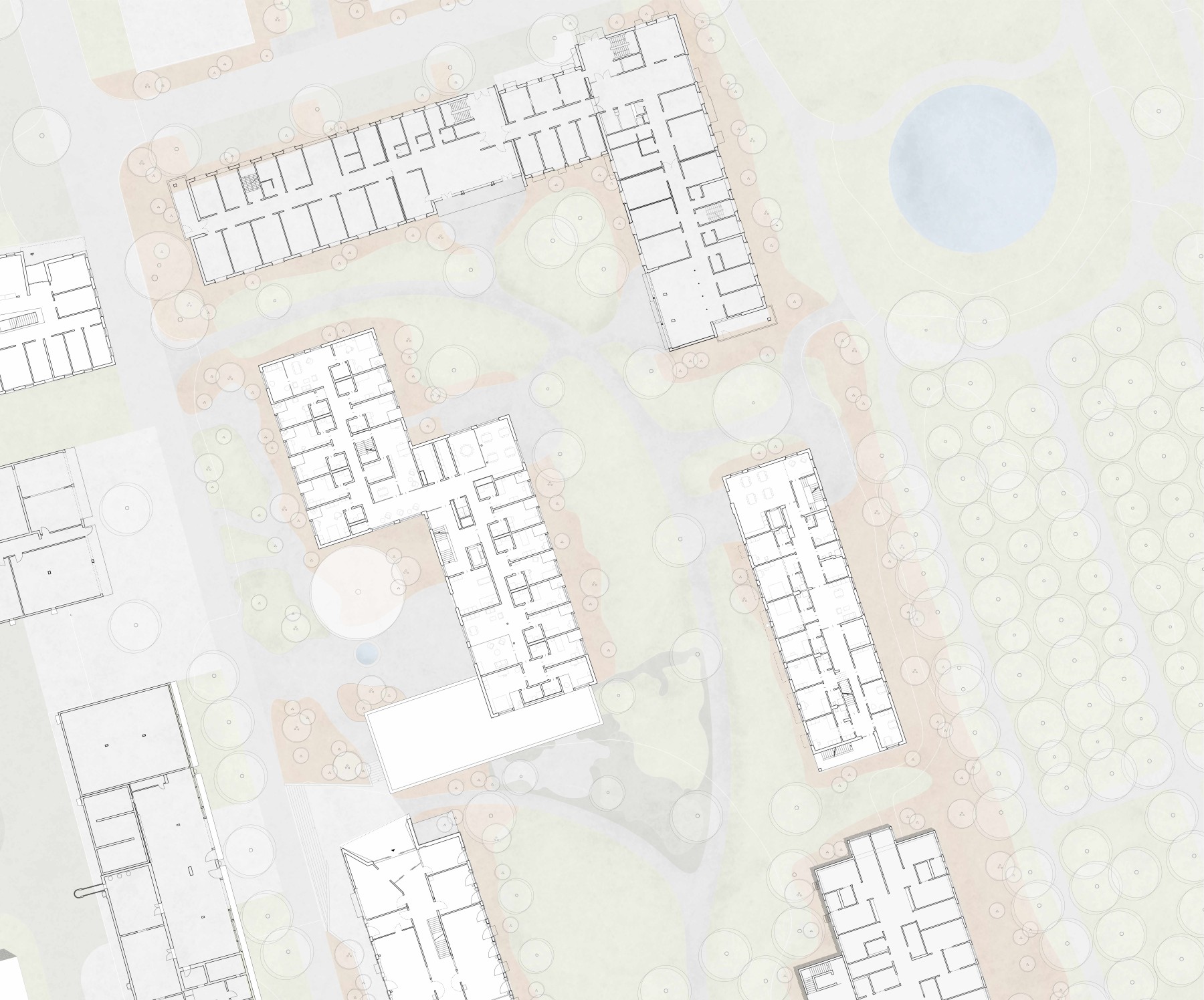 Drei Häuser beherbergen je eine über 2 Geschosse organisierte Doppelwohngruppe mit einem 2-geschossigen Gemeinschaftsraum. Die clusterartige Organisation der Wohngruppen nimmt die eigentliche vorgesehene Wohnnutzung vorweg.