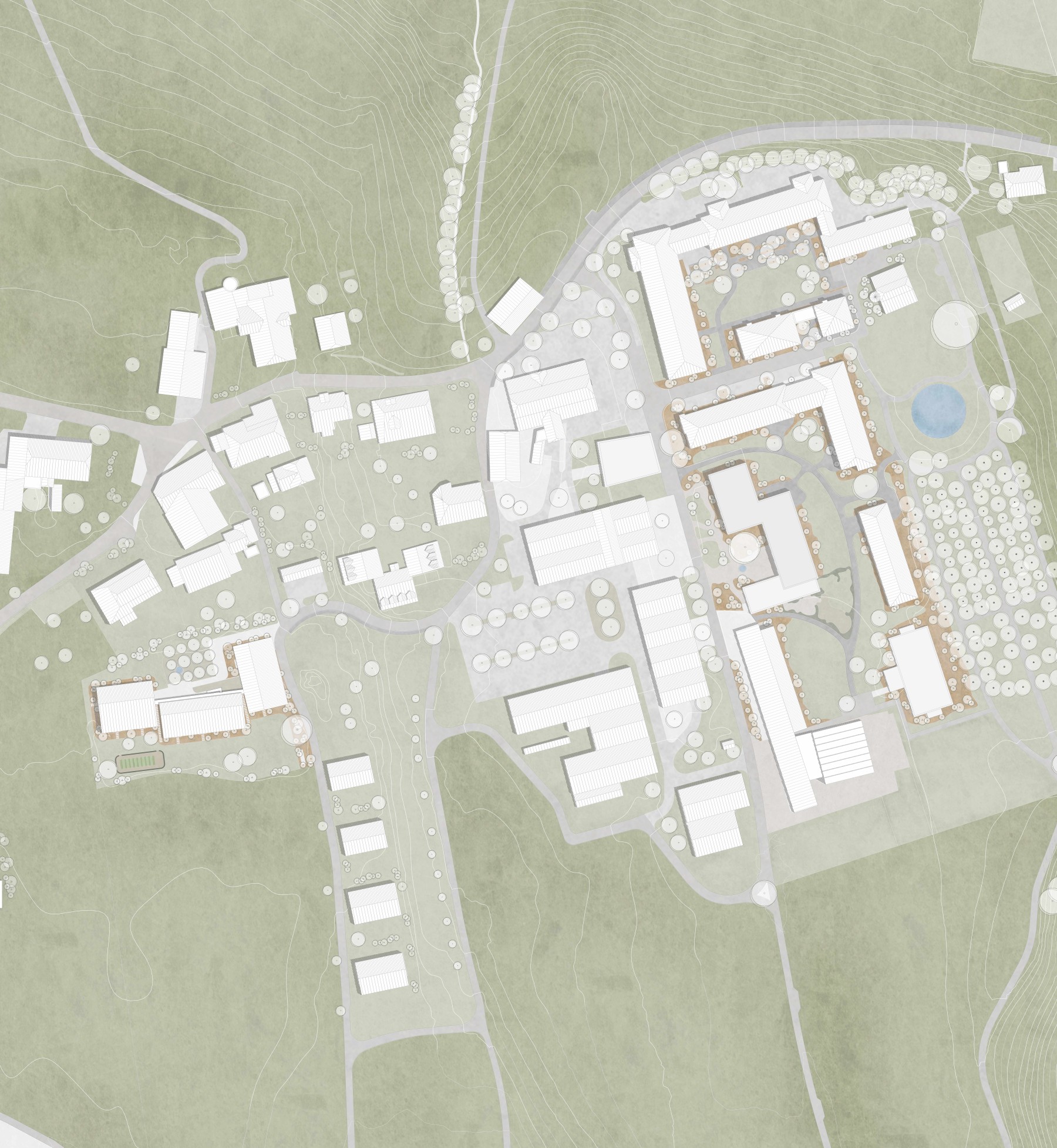 Im peripher gelegenen Perimeter ”Gantrischweg” geben der Massstab und die Stellung der umliegenden, landwirtschaftlich geprägten Bauten die Konstellation der Neubauten vor. In Kombination mit der prominenten Lage am Übergang zur offenen Landschaftskammer entsteht ein eigenständiges Ensemble mit starker Identität, das über einen räumlich definierten Ankunftsplatz auch mit den gegenüberliegenden Landwirtschaftsgebäuden in einen ortsbaulichen Dialog tritt.